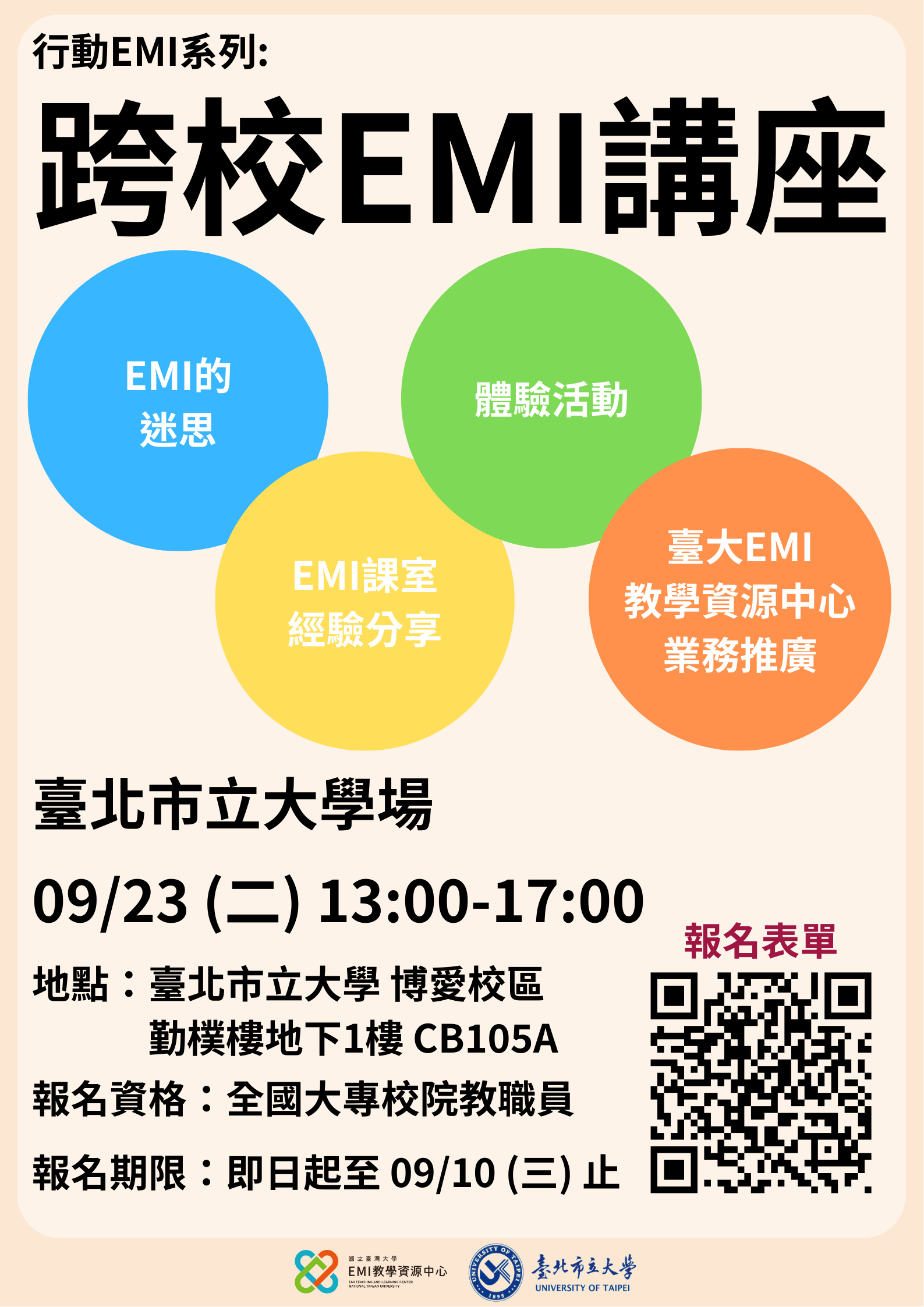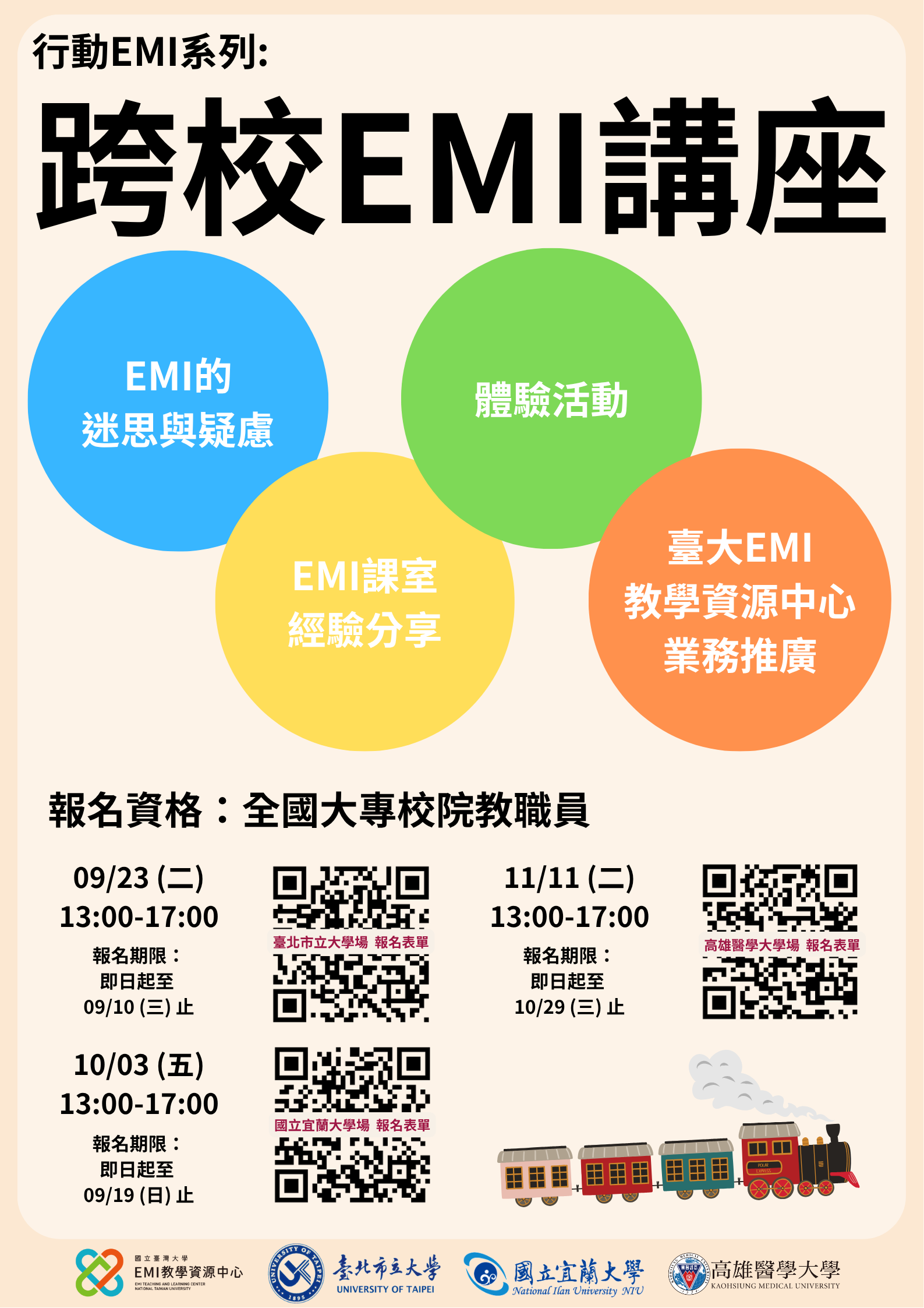 不論您是對EMI有疑慮、第一次接觸EMI、已經有EMI課室經驗的老師或是協助推動EMI課程的職員,都歡迎您來參加這場講座。